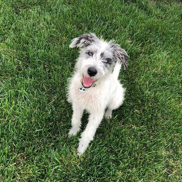 fluffy dog with two colored eyes sitting outside in grass